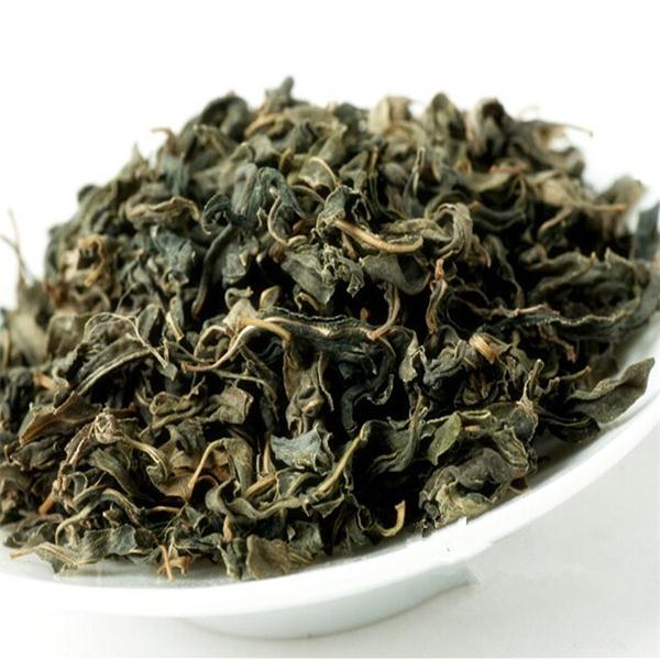 【性状】本品多皱缩卷曲,有的破碎,完整叶片展平后呈椭圆状披针形或卵圆状披针形,长2~5cm,宽0.5~2cm,淡绿色或灰绿色,先端钝,有小芒尖,基部钝圆或楔形,边缘具细齿,常反卷,两面无毛,叶脉于下表面突起;叶柄细,长约4mm。质脆。气微,味淡。